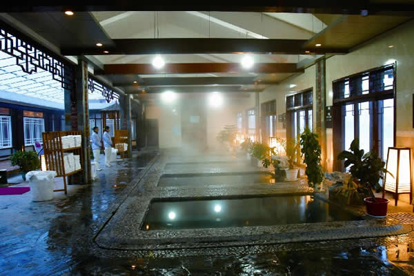江埡溫泉主要硬件特色是高標(biāo)準(zhǔn)的自然園林式露天溫泉與室內(nèi)溫泉,建有同心池、六福湯、瀑布溫泉、石板溫泉、椰奶溫泉、花草溫泉、咖啡溫泉、紅酒溫泉等,布局體現(xiàn)出鄉(xiāng)土格調(diào),鵝卵石、青石板鋪地, 假山瀑布,小橋流水,20余種各賦特色、各具功能的溫泉池鑲嵌其中, 一派恬淡寧?kù)o的詩(shī)情畫意。