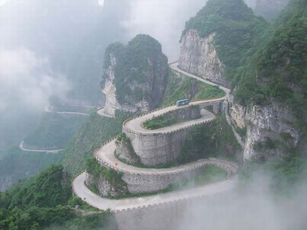 張家界天門(mén)山盤(pán)山公路有"通天大道"之稱(chēng),盤(pán)山公路全長(zhǎng)10.77公里,海拔從200米急劇提升到1300米,大道兩側(cè)絕壁千仞,空谷幽深,共計(jì)99個(gè)彎,180度急彎此消彼長(zhǎng),似玉帶環(huán)繞,彎彎緊連,層層迭起,被譽(yù)為“天下第一公路奇觀”。