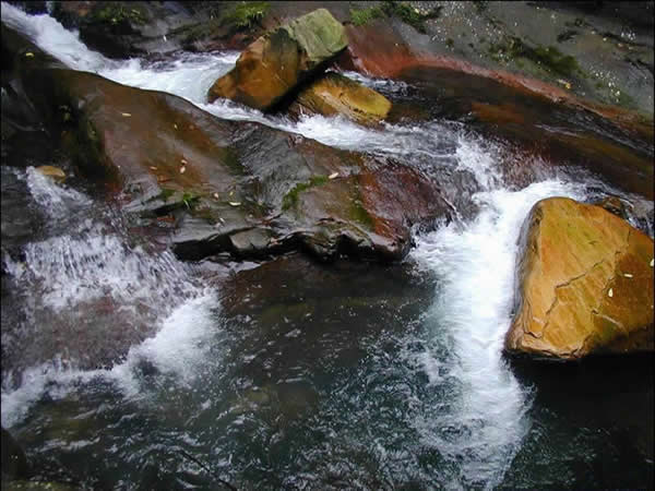 | 紫草潭位于張家界國家森林公園內,金鞭溪與砂刀溝匯合處。潭谷為紫紅色砂巖,因流水經多次沖刷成槽狀,而名為紫草潭。潭長約8米,寬約2米,深2米。潭水清澈見底,加之因奇峰、綠樹、紫石映入潭底,斑駁陸離,水光鱗鱗,綠影搖曳,極為自然和諧。潭上小橋為一塊完整的天然巨石,三米多長,二米寬。